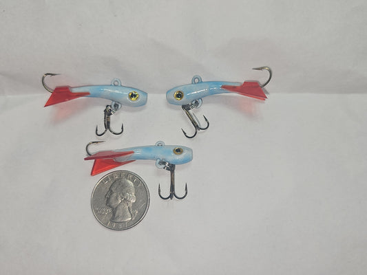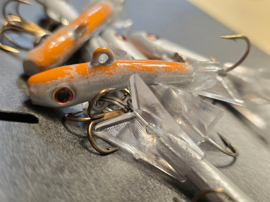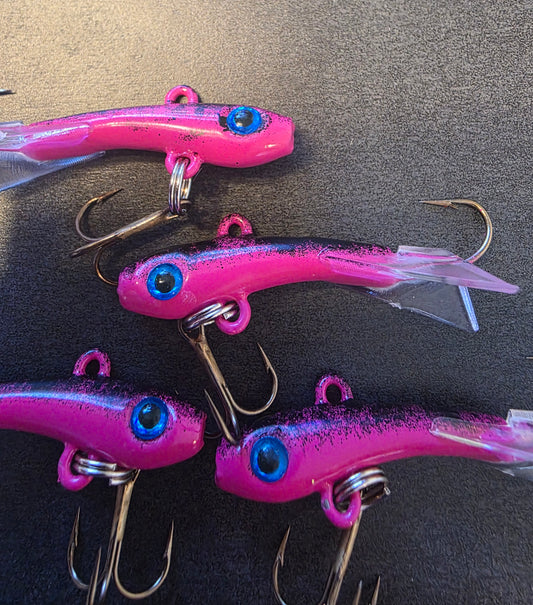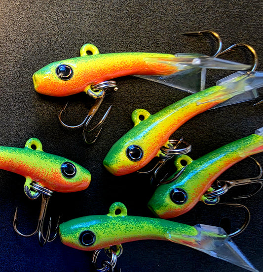 Wigglebutts are fun to throw from shore or a boat! We love to use them ice fishing for the monster walleyes and other predator fish! The spinning spoon on the back attracts fish from long distances which is a blast to watch on livescope!